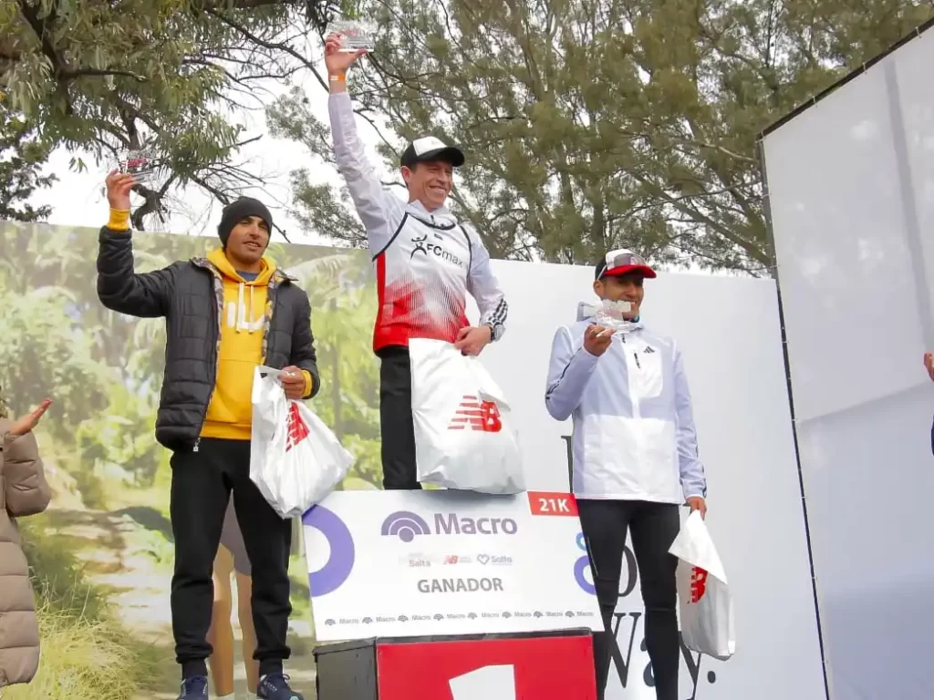 En el recorrido de 21k, Nery Chávez, maratonista de Santiago del Estero, llegó en el primer lugar con un tiempo de 1 hora, 7 minutos y 25 segundos. “Fue una carrera muy linda, estoy muy agradecido a la gente de Salta que me hizo sentir el apoyo”, dijo el ganador, quien fue acompañado en el podio por el salteño Esteban Angulo, que se mostró contento por su performance. “Fue una carrera estratégica, pude remontar”, comentó.